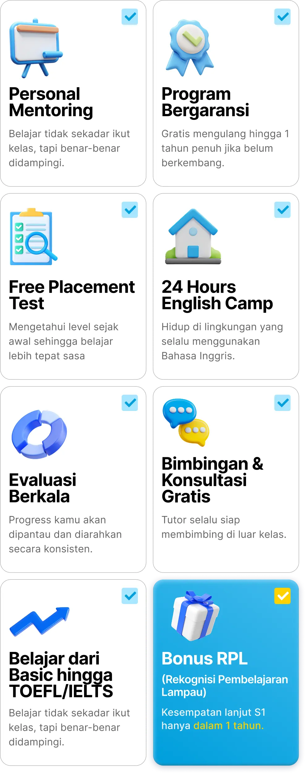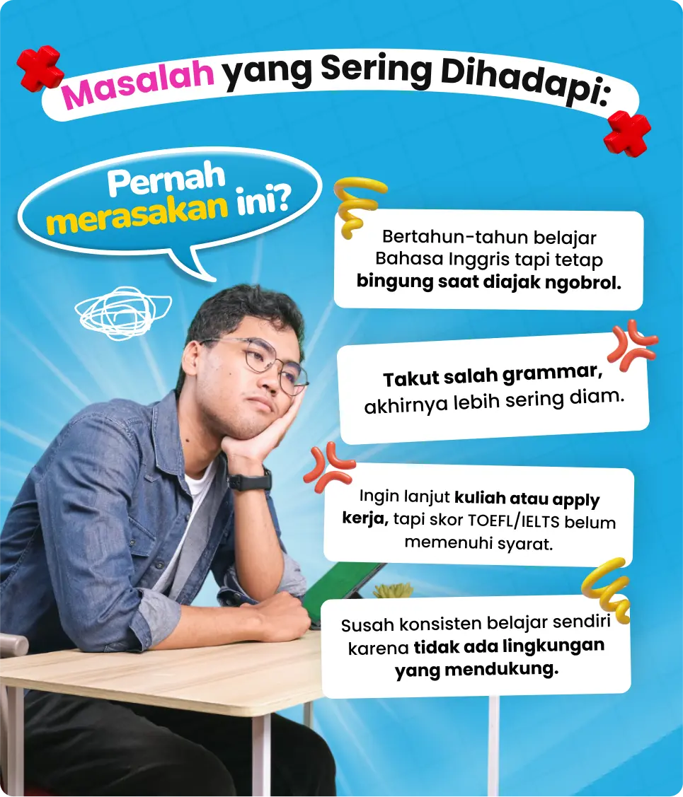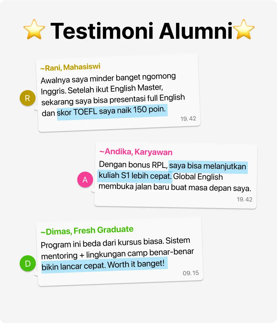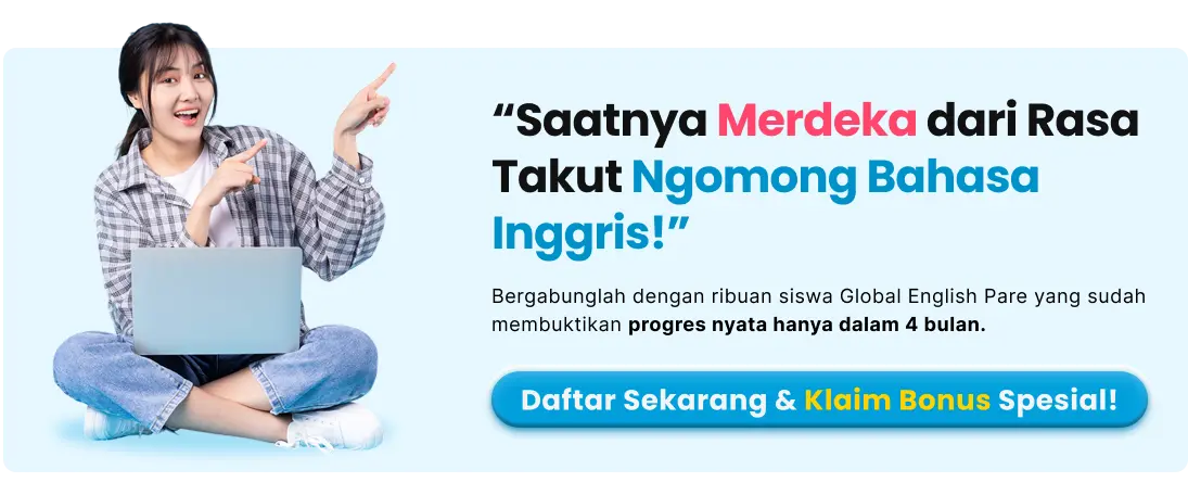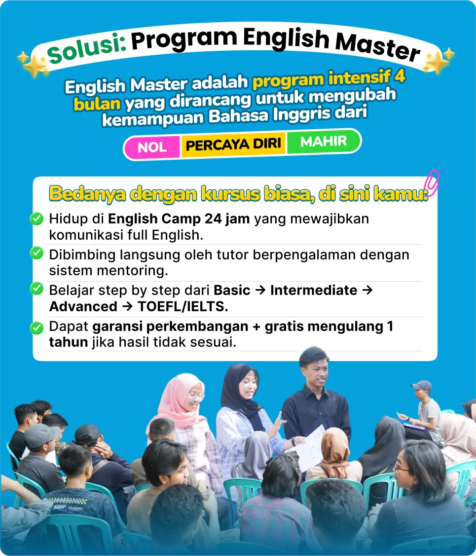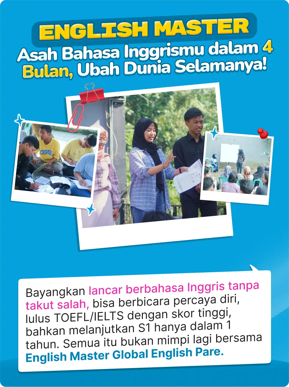 Lancar berbahasa Inggris tanpa takut salah, bisa berbicara percaya diri, lulus TOEFL/IELTS dengan skor tinggi, bahkan melanjutkan S1 hanya dalam 1 tahun. Semua itu bukan mimpi lagi bersama English Master Global English Pare.